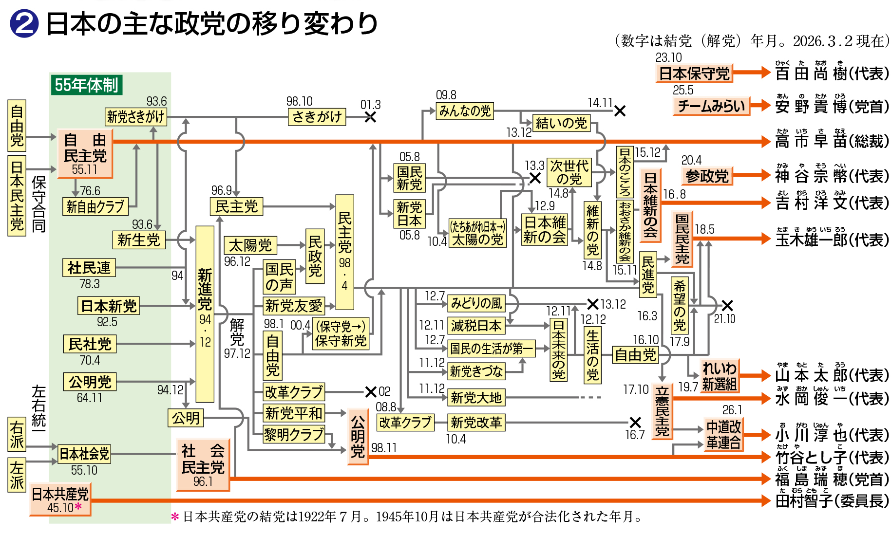2026年に立憲民主党と公明党の衆議院議員が合流し結党。生活者ファーストや食料品の消費税ゼロを掲げる。なお参議院では立憲民主党と公明党が存続している。 |