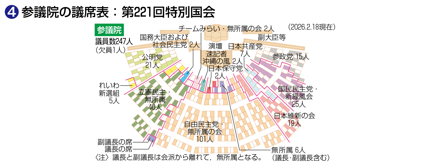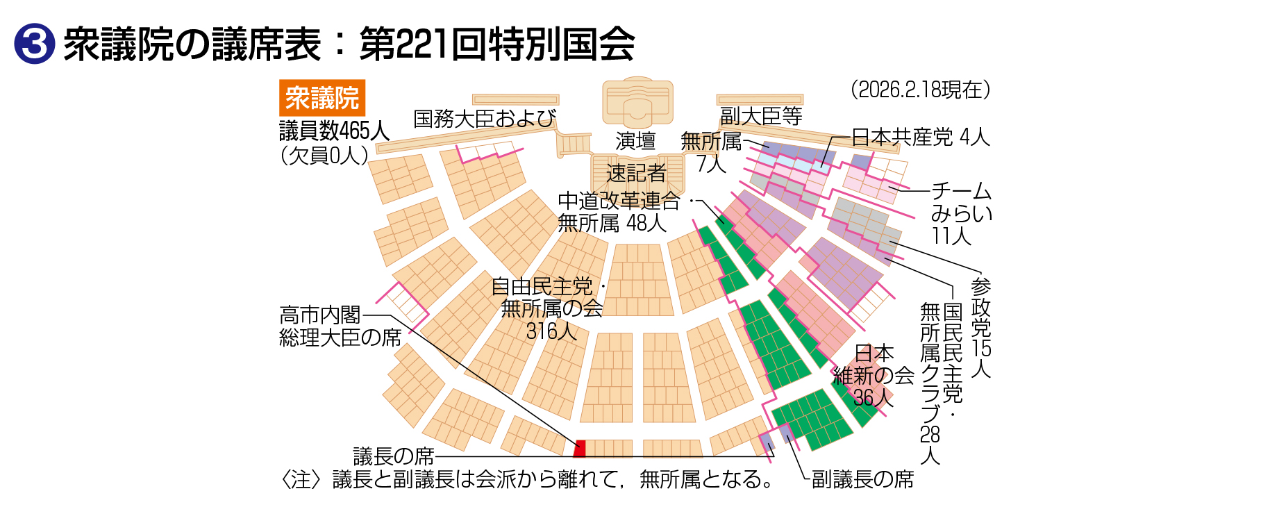 〈注〉政党・政治団体名,議員数は2026年3月2日現在。沖縄社会大衆党は政党助成法の政党要件を満たしていない政治団体。