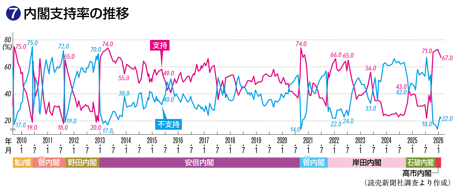 1955年,自由党と日本民主党の保守合同で成立。一時期を除き一貫し政権維持。保守政党だが政策は幅広く,派閥実力者による総裁交代が政権交代の役割を果たしてきた。2009年総選挙では民主党に歴史的大敗を喫し野党となったが,2012年12月与党に復帰。2026年の衆院選では議席数を大きく増やし,史上初めて単独で3分の2を上回った。 |